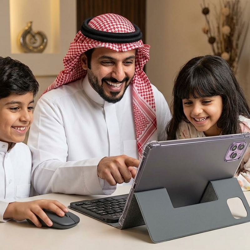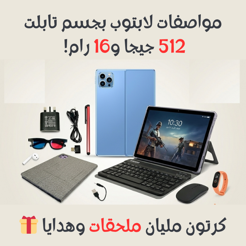 ✔️ مكتب متنقل: يجي معاه كيبورد وماوس لاسلكي وسماعة ايربودز، يعني لابتوب صغير بجيبك!