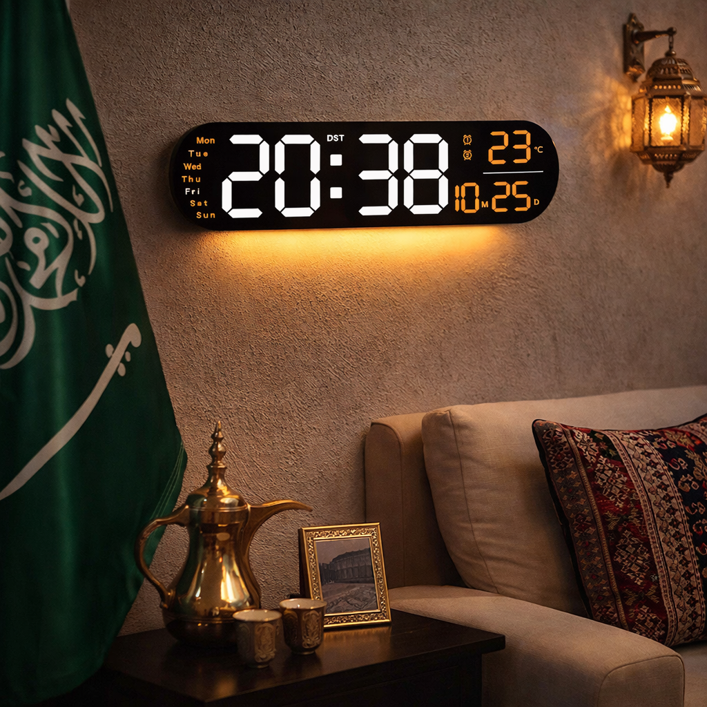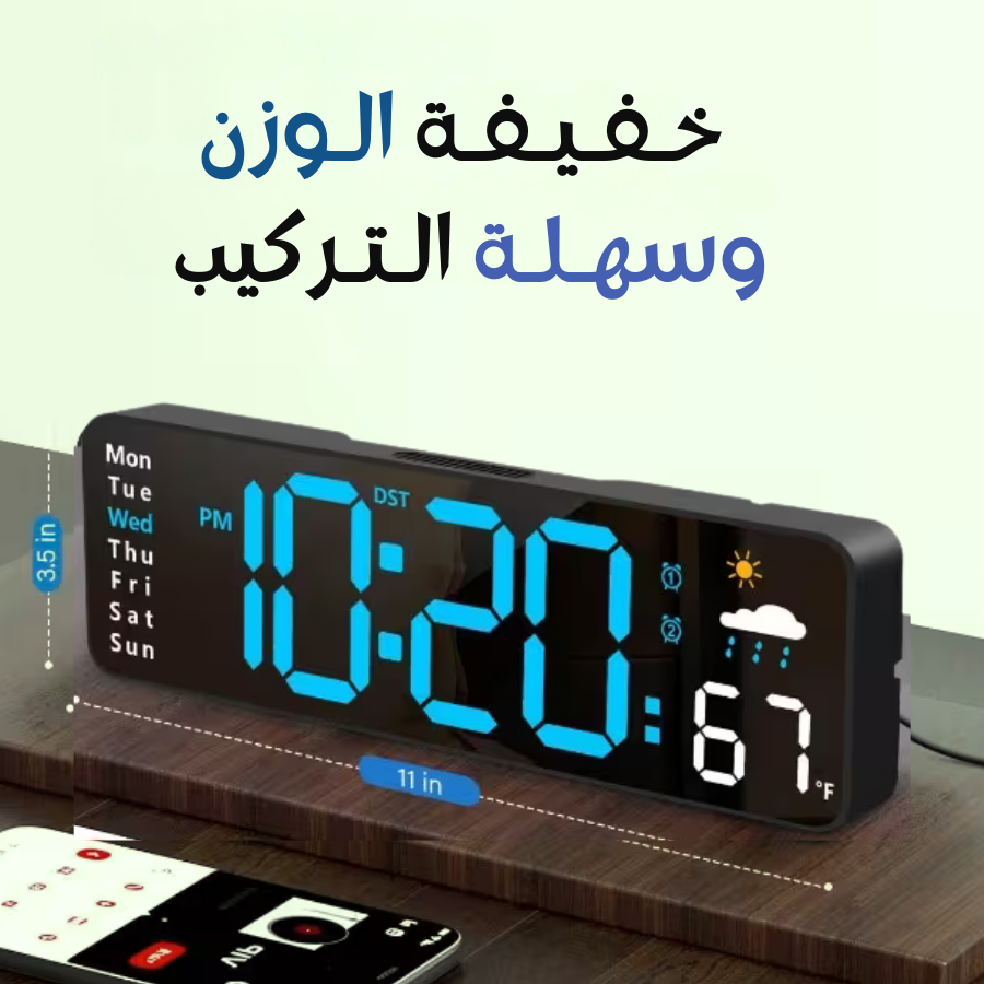 ✨ المميزات : ✔️ وضوح خيالي: شاشة عملاقة مقاس 13.7 إنش تعرض لك (الوقت، التاريخ، اليوم، والحرارة) بوضوح تام ومريح للعين. ✔️ أجواء ليلية ساحرة: مزودة بإضاءة RGB دافئة تلون غرفتك بالليل وتعطيك لمسة ديكور مودرن بدون ما تضطر تشغل لمبات الغرفة. ✔️ ذكاء في السطوع: تحتوي على حساس ضوء يغير سطوع الشاشة تلقائياً حسب إضاءة الغرفة عشان ما تزعجك وقت النوم. ✔️ منبه ذكي: سهلة الضبط للكبار والأطفال، وتعتبر المنبه المثالي لتنظيم يوم عائلتك بكل هدوء. ✔️ مرونة في التثبيت: تقدر تعلقها على الحائط كتحفة فنية، أو تحطها على الطاولة والمكتب كإضافة عصرية. ✔️توفير وراحة: تدعم الضبط التلقائي للتوقيت الصيفي، يعني ما تشيل هم تعديل الوقت يدوياً كل موسم. ✔️ أمان ضد الانقطاع: مزودة ببطارية احتياطية تحفظ لك الإعدادات والوقت حتى لو انقطعت الكهرباء.